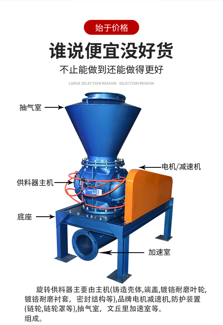 旋轉供料器的主要構成是:主閥(殼體、端蓋、葉輪)、電機減速機、防護裝置(鏈輪)、抽氣室、加速室、防卡進料器等。